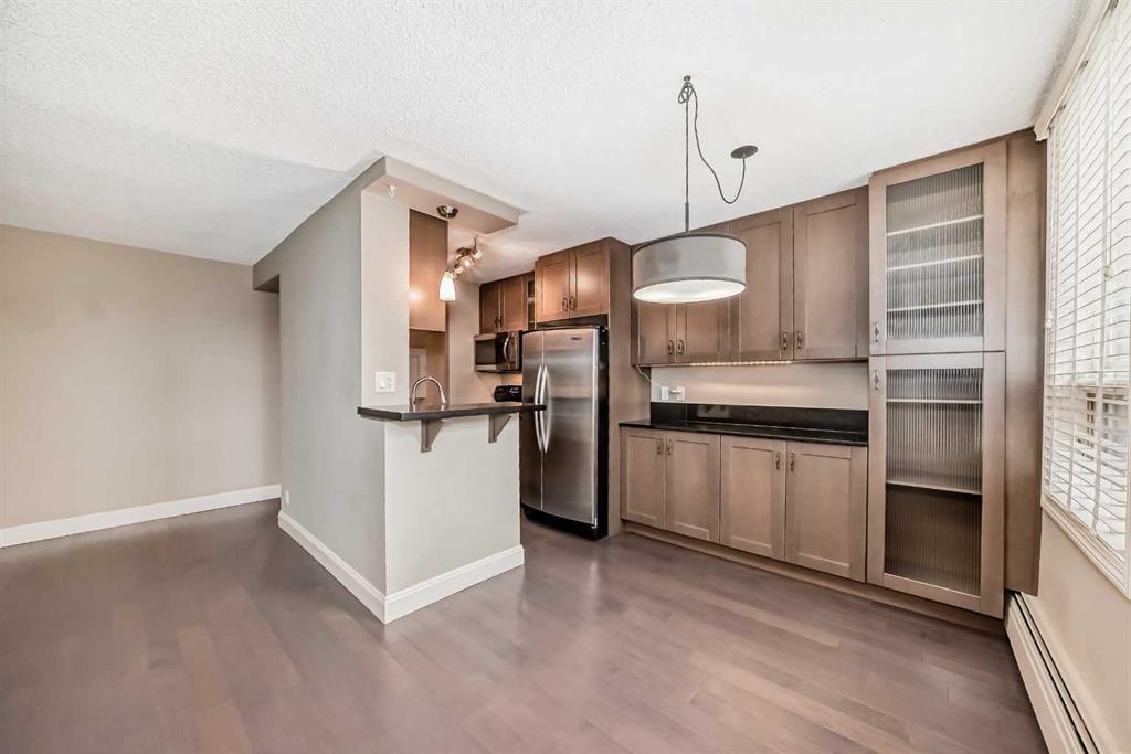 This executive one-bedroom condo at Centro 733 offers modern living just minutes from the vibrant shops, dining, and amenities on 17th Ave, and within easy reach of downtown by foot or bike. The bright, open floor plan features a south-facing wall of windows, a stylish kitchen with granite countertops, stainless steel appliances, and upgraded vinyl plank flooring, along with a cozy breakfast nook. Additional highlights include a spacious bedroom, full bathroom, European laundry, storage locker, and assigned parking. Building amenities include a fully equipped gym and owner’s lounge. Condo fees cover heat, water, sewer, and electricity.