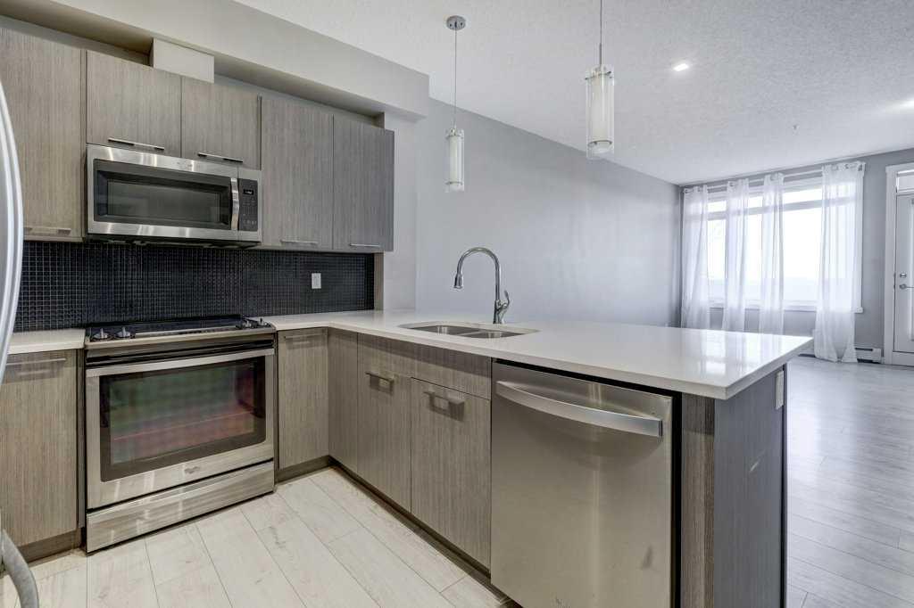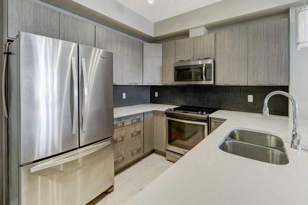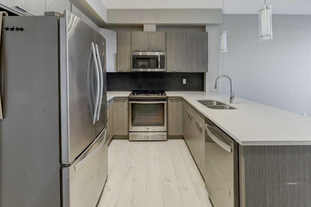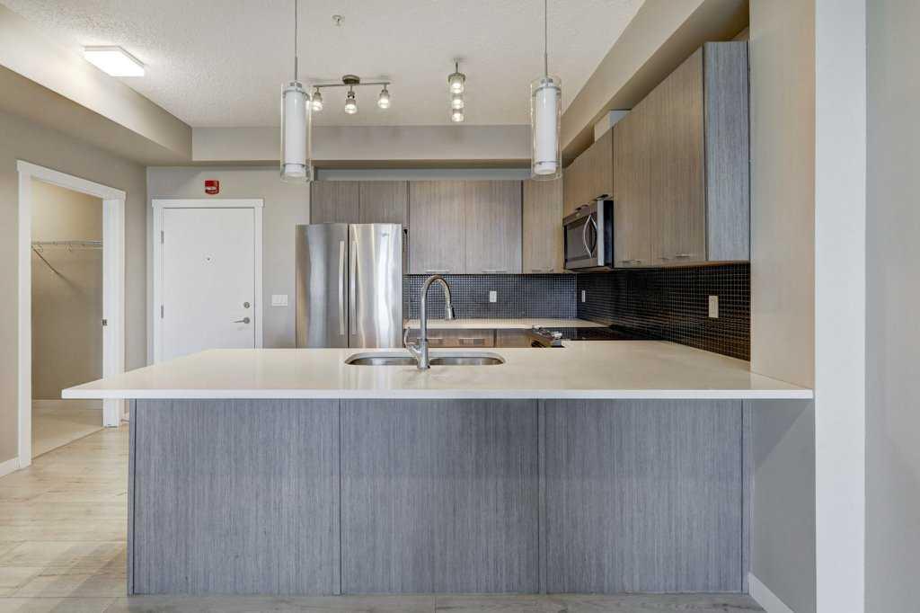 Step into this beautifully designed 1-bedroom, 1-bath main-floor condo with a bright, open-concept layout, perfect for contemporary living. The spacious floor plan offers 9-foot ceilings, a large laundry room with extra storage, and expansive windows that invite plenty of natural sunlight. Enjoy a modern kitchen equipped with sleek stainless-steel appliances, quartz countertops, and ample cabinet space. The kitchen island with bar seating seamlessly connects to the dining and living areas, making it ideal for entertaining or relaxing. The generously sized bedroom features a convenient walk-through closet leading into a 4-piece bathroom. Outside, your private patio includes a gas hookup—perfect for summer BBQs and lounging. This complex offers plenty of visitor parking, a picnic area, and a beautifully landscaped courtyard. With a titled surface parking stall right out front, an elevator, and bike storage, this property provides both convenience and value. Located steps from schools, parks, pathways, and a variety of shopping and dining options, you’ll love the easy access to major retailers like Walmart and Costco, along with nearby roadways that make commuting a breeze. Don’t miss your chance to own this wonderful home in a highly desirable area!