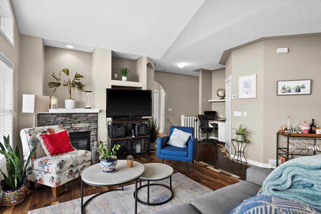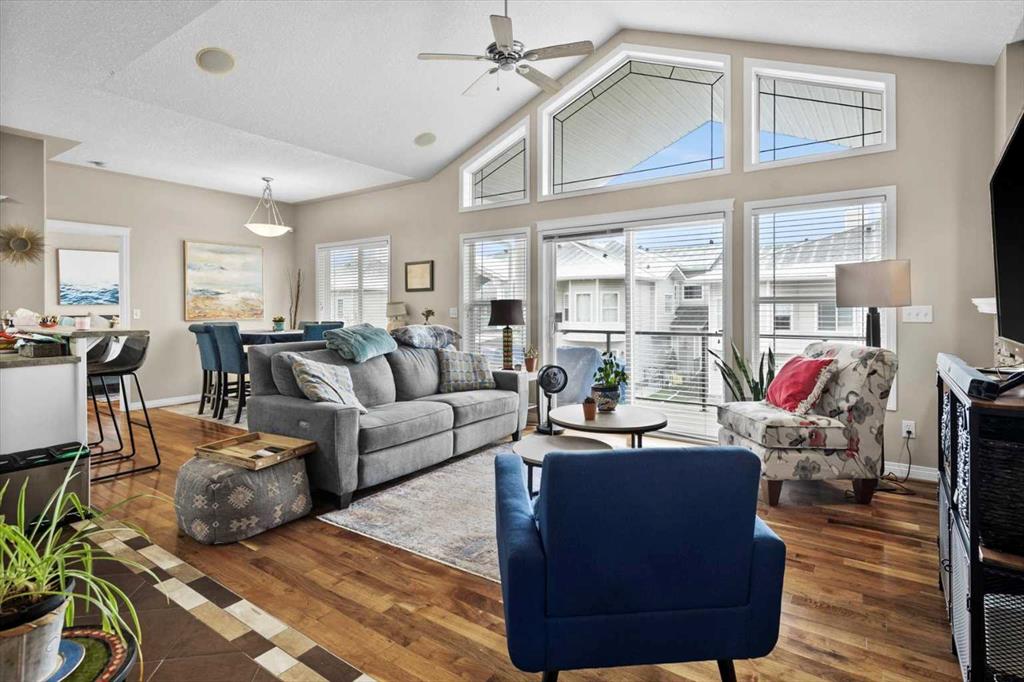 This inviting bungalow-style townhouse offers an airy, open-concept layout perfect for comfortable living and entertaining. Extensive hardwood and tile flooring add warmth and elegance throughout. The expansive great room features soaring vaulted ceilings, large windows that flood the space with natural light, a cozy fireplace framed with built-in shelving, ceiling speakers for surround sound, and a ceiling fan for added comfort. The classic white kitchen boasts stainless steel appliances, a convenient breakfast bar, and a built-in computer desk cleverly tucked into a niche—ideal for working from home or managing daily tasks. The thoughtfully designed layout places the two bedrooms on opposite sides of the main living area, ensuring privacy. The primary suite is a serene retreat, highlighted by a picturesque bay window, a spacious walk-in closet, and a spa-like ensuite with a corner jetted tub beneath a window, a separate shower, and heated tile floors for those chilly mornings. A single attached garage provides added convenience, and the location is ideal—just steps from transit and the C-train for easy commuting. As a bonus, the affordable HOA fee grants access to the exclusive 'Lake Club' amenities. Residents can enjoy the fitness centre, games room, theatre, and rentable activity room—perfect for gatherings or events. This is a wonderful opportunity to own a beautifully designed home in a sought-after complex, combining style, comfort, and convenience in one delightful package!