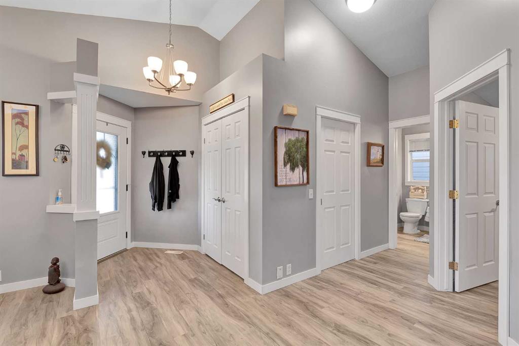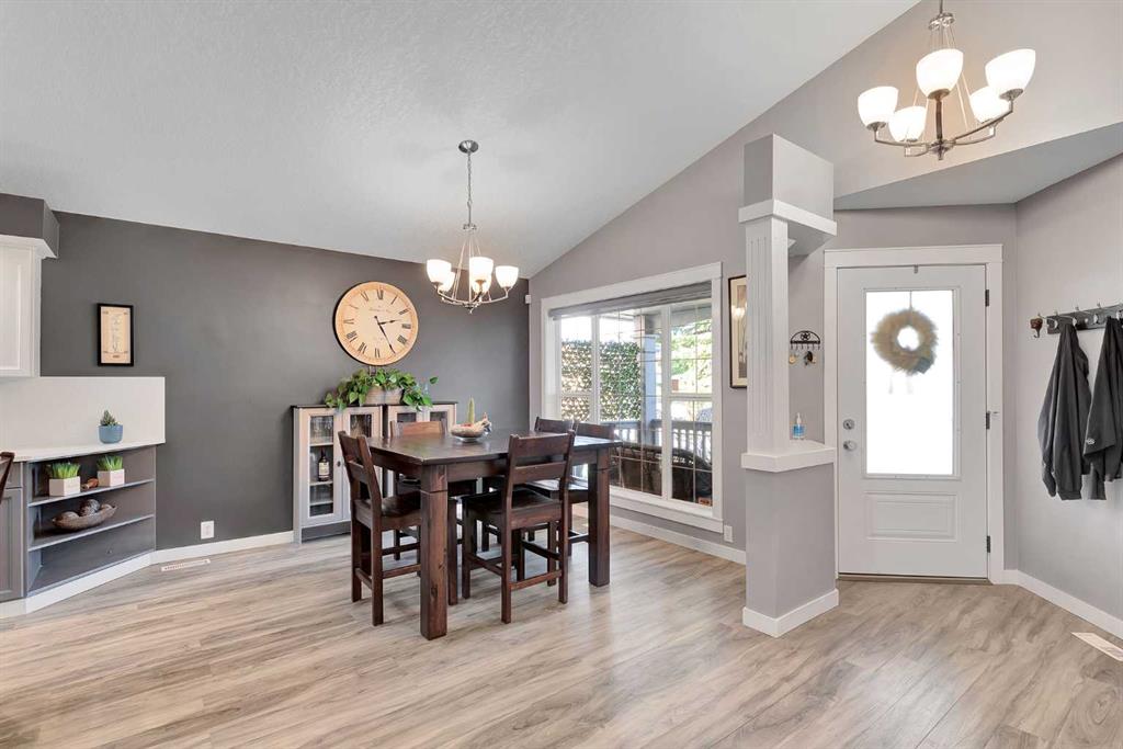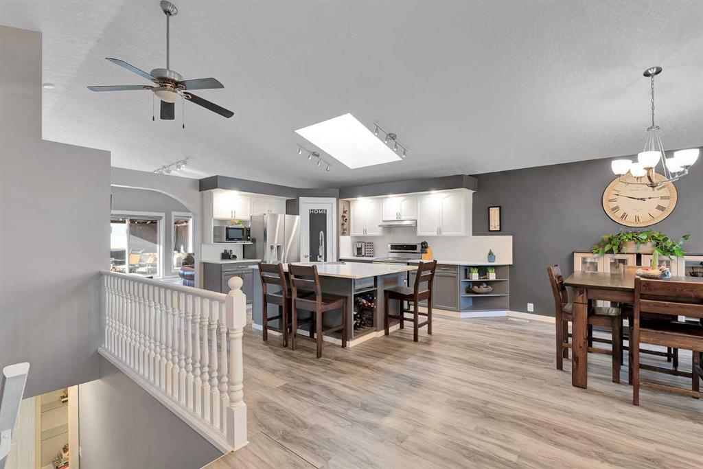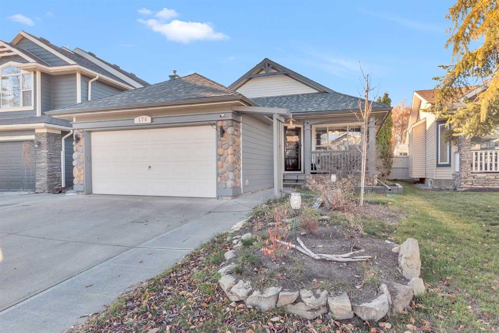 Welcome to this enchanting bungalow, offering over 2,600 square feet of thoughtfully designed living space. As you approach the home, its unique character is immediately evident, enhanced by durable Hardy board siding and Level 4 shingles that promise lasting beauty in any weather. In the evenings, set the mood with customizable Lumenox all-season lights, perfect for creating your desired ambiance. Step inside to discover a recently updated open-concept kitchen and dining area, highlighted by stunning vaulted ceilings and a strategically positioned skylight above the island. To your left, a versatile spare bedroom awaits, ideal for use as a home office, alongside a convenient laundry room and a main floor three-piece bathroom. As you explore further, elegant arches and cutouts provide an artistic transition to the living area and primary bedroom. The inviting living room features a beautiful gas fireplace, soaring vaulted ceilings, and large glass patio doors that offer seamless access to the backyard deck. The primary bedroom is a true retreat, boasting a spacious walk-in closet and a luxurious four-piece ensuite, complete with a jetted soaker tub and a separate shower. A second skylight positioned over the tub allows you to enjoy the evening sky as you unwind. Downstairs, you’ll find a generously sized finished family room and game area, along with two additional bedrooms that share a convenient Jack and Jill bathroom—perfect for children or guests. Ample storage space is also available for all your holiday decorations and more. Located in the beautiful community of Chaparral, this home offers lake access just minutes from your front door. Don’t miss this opportunity to make this stunning property your new home!