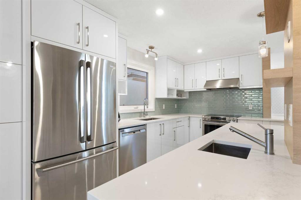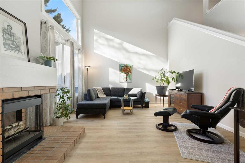 Bright RENOVATED 1.5 story END UNIT townhome with huge main floor master suite, south facing backyard, vaulted ceilings and DOUBLE ATTACHED garage. Updates include contemporary kitchen cabinets, quartz countertops, upgraded stainless steel appliances, designer glass tile backsplash, pot lights, engineered hardwood and luxury vinyl flooring. The spacious main floor master bedroom has an gorgeous spa like 4 pc en-suite with cozy in-floor heat and lots of closet space. To complete the main floor: Living room with floor to ceiling windows & wood burning fireplace, dining room with built-in, office/den, kitchen nook, 1/2 bathroom, laundry room and storage. Upstairs there is another large bedroom, full bathroom, loft flex space and more storage! The home has a high efficiency furnace & hot water tank installed in 2018, and newer vinyl windows. French doors lead to the sunny SOUTH facing deck and backyard. BUNGALOW style living in the sought after community of Woodlands near the community center, golf, recreation, shopping and Fish Creek Park. The Wood Meadows condo complex is pristine with lots of green space and very well taken care of.