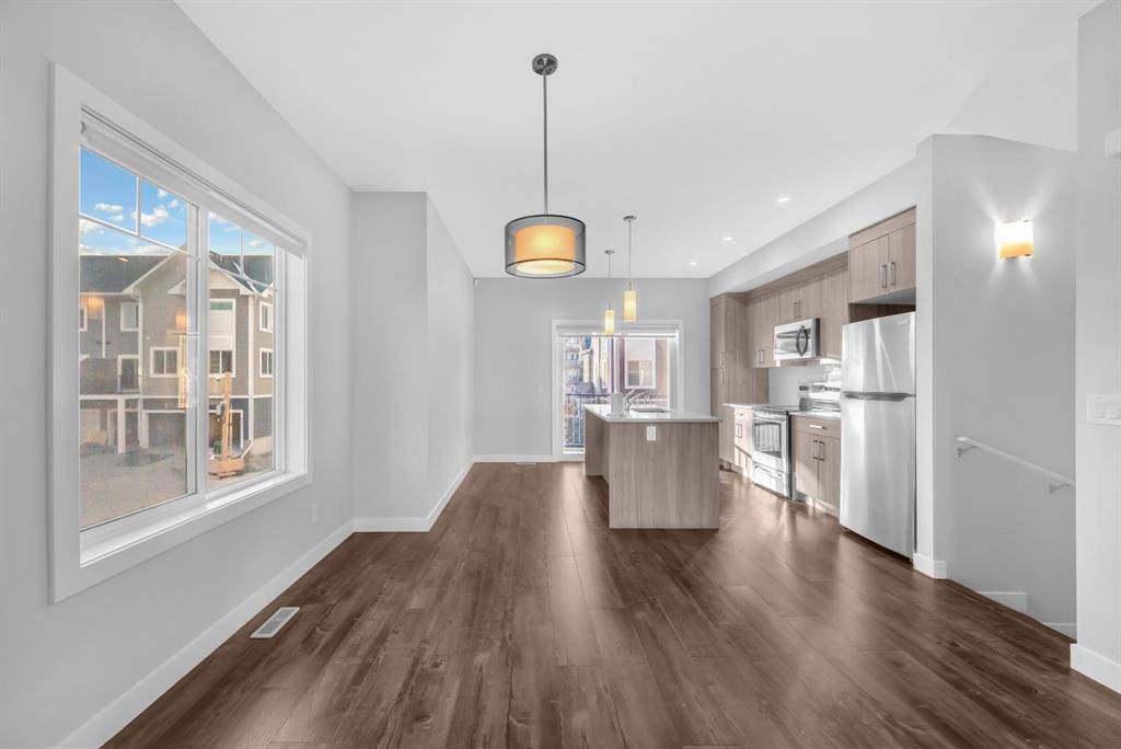 Public Remarks Welcome to your dream home! This stunning corner unit townhouse, built in 2022, boasts over 1,500 square feet of thoughtfully designed living space in the desirable Canals community of Airdrie. As you step inside, you’ll be greeted by an abundance of natural light that highlights the fresh, contemporary paint throughout. The main floor features a spacious and versatile den, perfect for a home office or cozy reading nook. The heart of the home is the open-concept kitchen, which includes a stylish island that invites family and friends to gather. Equipped with modern appliances and ample cabinetry, this kitchen is a chef's paradise, offering both functionality and elegance. Moving to the upper level, you will find three generously sized bedrooms that provide a peaceful retreat for rest and relaxation. The primary suite is a true sanctuary, complete with a large window and a private en-suite bath, ensuring comfort and privacy. Enjoy the convenience of nearby amenities, parks, and walking trails in this vibrant community. The attached garage provides additional storage or parking solutions. Don’t miss the opportunity to call this exquisite townhouse your home—it perfectly combines modern living with comfort and style. Schedule your viewing today!
