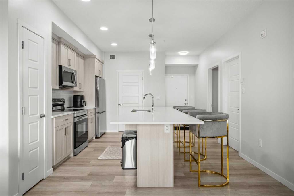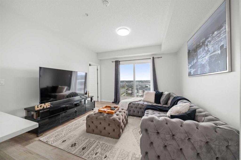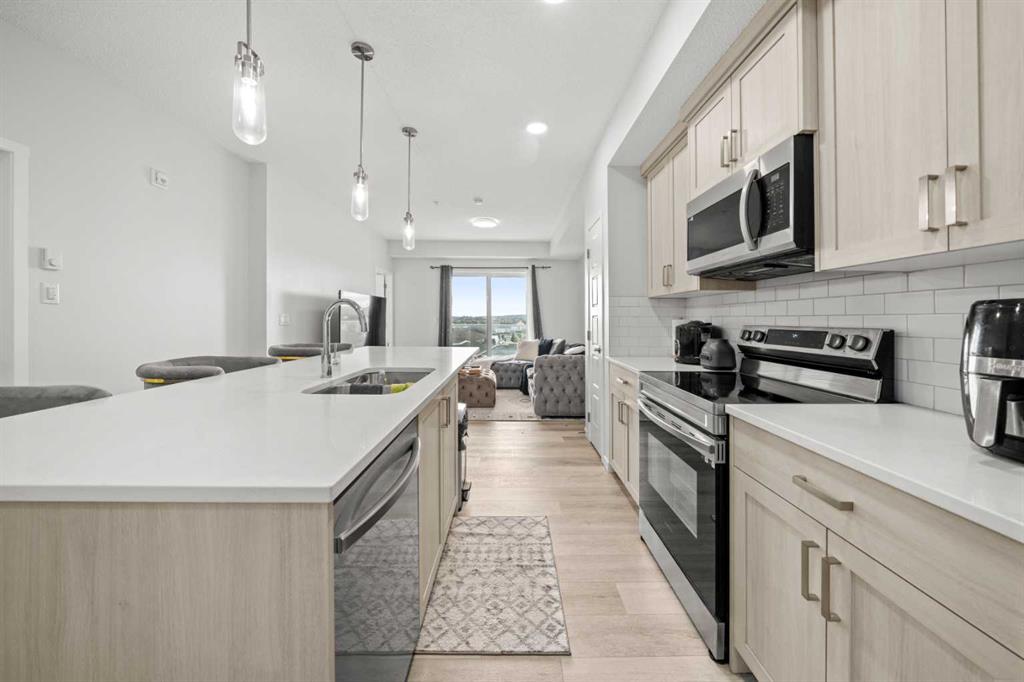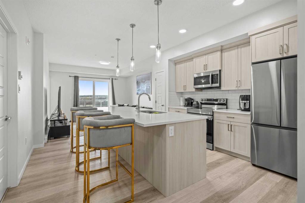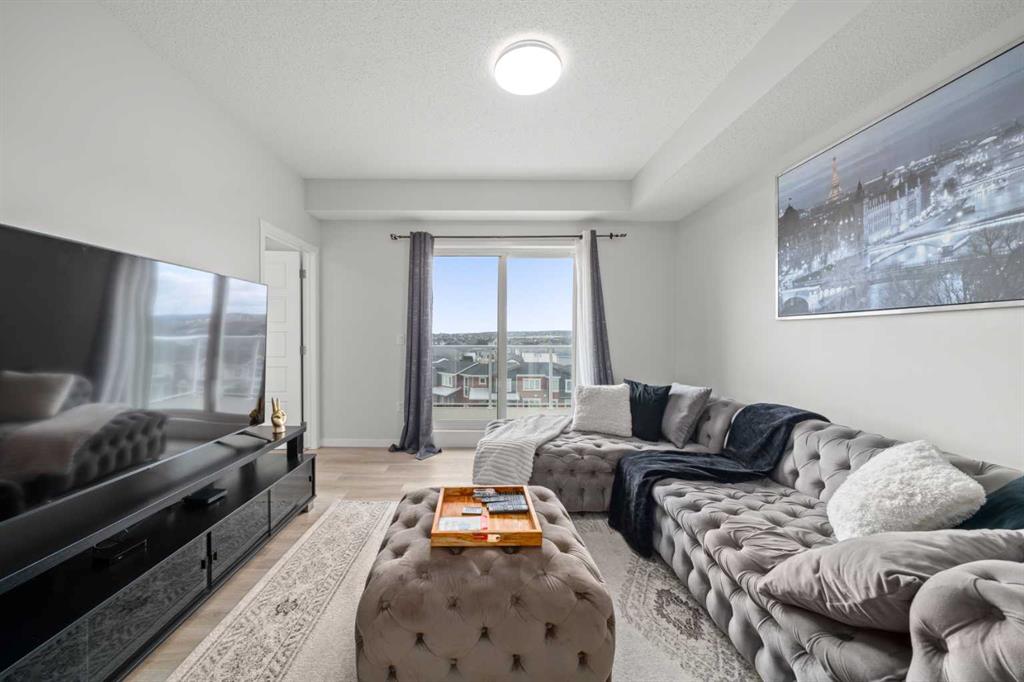 Well maintained and beautifully styled 2 bedroom, 2 bathroom TOP FLOOR SOUTH-FACING unit! The open concept floor plan is both beautiful and functional with WIDE PLANK FLOORING, a neutral colour pallet, QUARTZ COUNTERTOPS throughout and an abundance of NATURAL LIGHT. Culinary creativity is inspired in the gorgeous kitchen featuring a large QUARTZ ISLAND with casual seating, STAINLESS STEEL APPLIANCES, FULL-HEIGHT CABINETS and an ENCLOSED PANTRY for extra storage. Clear sightlines into the living room provide great connectivity. Patio sliders lead to the BALCONY WITH A GAS LINE encouraging weekend barbeques with family and friends. Facing south, this great outdoor space is bathed in sunshine. The primary bedroom is a relaxing retreat with a spacious design, a large closet and a PRIVATE 4-PIECE ENSUITE with quartz countertops. A SECOND BEDROOM, A SECOND FULL BATHROOM AND IN-SUITE LAUNDRY with storage further add to your comfort and convenience. ACROSS THE STREET IS AN EXCELLENT PARK boasting a playground, basketball court, a skate park and lots of beautiful green space. SHOPS, RESTAURANTS AND AMENITIES ARE JUST AROUND THE CORNER. This master-planned community enjoys direct access to Stoney Trail making a trip downtown or a weekend escape to the mountains quick and easy. An extensive pathway system winds around wetlands with lookouts facing the majestic Rocky Mountains along the way. A future school site and commercial centre will put education, restaurants, shops and employment opportunities at residents’ doorsteps plus the future Green Line will connect Carrington to the city centre and beyond. This is your chance to own in a phenomenal up and coming neighbourhood!
